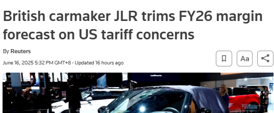 【环球网财经综合报道】据路透社报道通牛网,英国豪华汽车制造商捷豹路虎(Jaguar Land Rover)将2026财年息税前利润率预测从之前的10%下调至5%-7%,理由是美国关税迫在眉睫,全球汽车业存在不确定性。此外,调整后的息税前利润率预测也低于捷豹路虎报告的截至3月31日的上一财年8.5%的利润率。